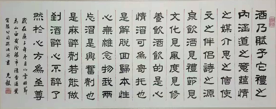 汾陽市清香酒業(yè)有限公司座落在中華名酒第一村---杏花村申明亭路9號。《汾酒曲》中記載,申明亭畔新淘井,水重依稀亞蟹黃 ,注解說:申明亭井水絕佳,以之釀酒,斤兩獨重。明末愛國詩人、書法家和醫(yī)學家傅山先生,曾為申明亭古井親筆題寫了得造花香四個大字,說明杏花井泉得天獨厚,釀出的美酒如同花香沁人心脾。 汾陽市清香酒業(yè)有限公司出品的清香型高端白酒用的是優(yōu)質(zhì)高粱、大麥和豌豆等上等原料和申明亭地下礦泉水,再加上杏花村土壤和空氣中獨有的菌群,在杏花村釀酒匠人的傳統(tǒng)工藝下精心釀造:清蒸二次清,固態(tài)地缸分離發(fā)酵,清字當頭,一清到底,釀出的酒:酒液晶亮、清香幽雅、醇凈柔和、回甜爽口、飲后余香,在國內(nèi)外享有盛譽。